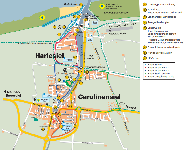Für ausgiebige Spaziergänge mit Ihrem Hund haben wir verschiedene Routen in unserer Karte eingezeichnet. Um das Nordseeheilbad Carolinensiel-Harlesiel vor den Hinterlassenschaften der Hunde zu schützen, bitten wir Sie diese mit den Hundekotbeuteln, welche Sie übrigens kostenlos an der Campinganmeldung, in der Cliner Quelle, Tourist-Info, bei der Firma BPS Service und im Edeka Scheidemann Marktplatz, erhalten, zu beseitigen. Die jeweiligen Standorte der Hunde-Service-Stationen finden Sie mit der Nummer (7) gekennzeichnet auf der Karte.